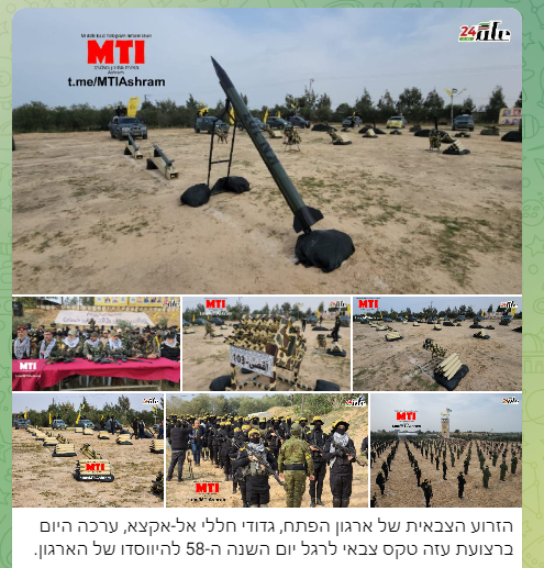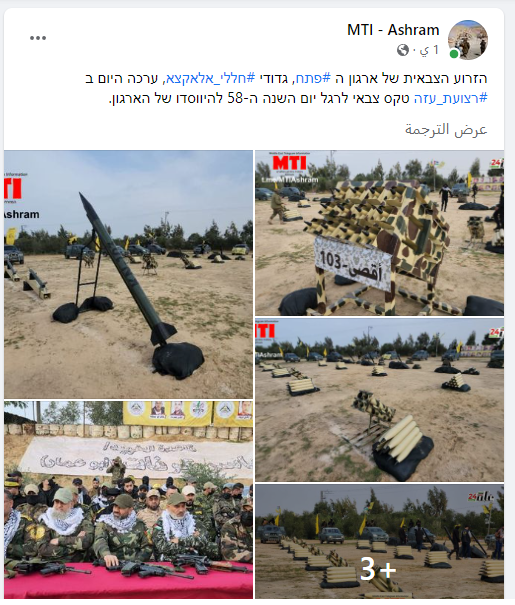 وتناولت الصفحات "الإسرائيلية" العرض العسكري الذي نظمته كتائب الأقصى وهي الإطار العسكري لحركة فتح، بالتركيز على الصاروخ الذي أزاحت الكتائب الستار عنه خلال العرض والذي يحمل اسم "معين"، مكتفيةً بالإشارة إلى أنها استخدمته في التصعيد الأخير.