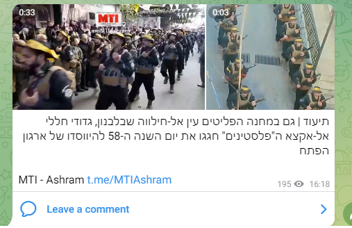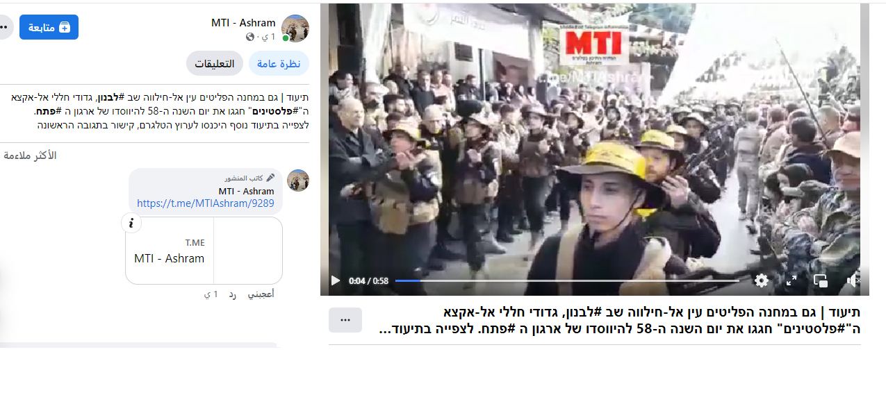 كما أشارت صفحات "إسرائيلية" أيضاً إلى أنَّ كتائب شهداء الأقصى في مخيم "عين الحلوة" جنوب لبنان، احتفلت أيضاً بذكرى انطلاقة حركة فتح والثورة الـ58، عبر عرض عسكري جاب شوارع المخيم.