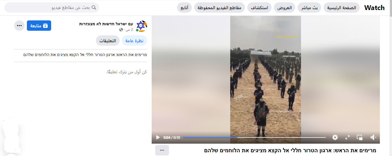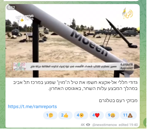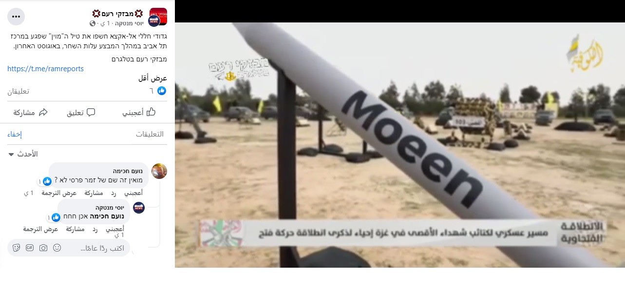 وجاء في صفحات "إسرائيلية" عبر موقع "فيسوك"، أن "كتائب شهداء الأقصى كشفت عن صاروخ "معين" في عرض عسكري بغزة"، مُشيرةً إلى أنَّ هذا الصاروخ أصاب وسط مدينة تل أبيب المُحتلة خلال التصعيد الأخير، فيما اكتفت صفحة "أخبار إسرائيل بدون رقابة" بعرض فيديو قصير من العرض العسكري، والتعليق عليه: "التنظيم الإرهابي يحتفل بعرض مقاتليه".