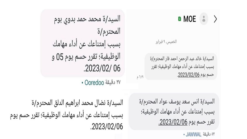 وأظهرت الرسائل النصية التي وصلت لعدد من المعلمين عبر هواتفهم النقالة، الخميس الماضي، أنّه تم حسم يوم عمل من بعضهم، ويومي عمل من آخرين؛ بسبب "الامتناع عن أداء مهامهم الوظيفية"، وفق ما جاء في نصّ الرسائل.
