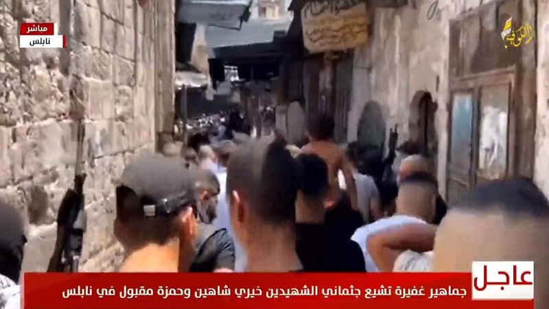 نابلس: شيعت جماهير غفيرة، جثماني الشهيدين حمزة مقبول وخيري شاهين في مدينة نابلس.