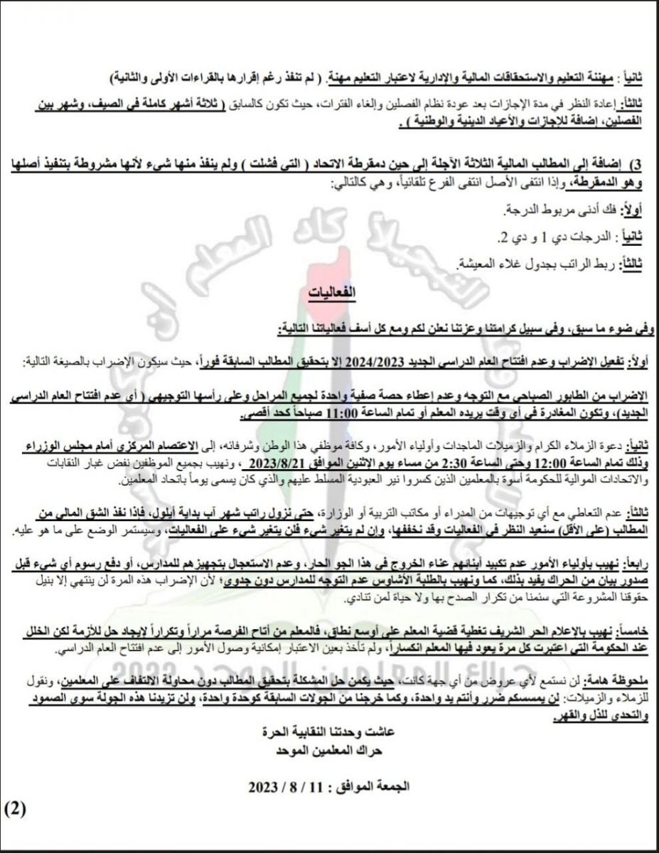 الكوفية أعلن حراك المعلمين الموحد انه لن يفتتح العام الدراسي الجديد الا بتحقيق كل مطالبه.