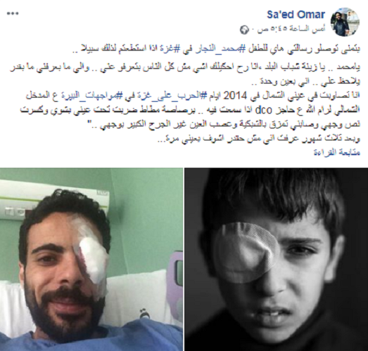 انا تصاوبت في عيني الشمال في 2014 ايام #الحرب_على_غزة في #مواجهات_البيرة ع المدخل الشمالي لرام الله ع حاجز dco اذا سمعت فيه .. برصاصة مطاط ضربت تحت عيني بشوي وكسرت نص وجهي وصابني تمزق بالشبكية وعصب العين غير الجرح الكبير بوجهي .."