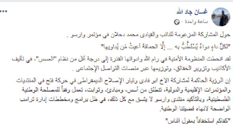 غزة // علق القيادي الفتحاوي غسان جادالله، مساء الأثنين ، حول المشاركة المزعومة للنائب والقيادى محمد دحلان فى مؤتمر وارسو .