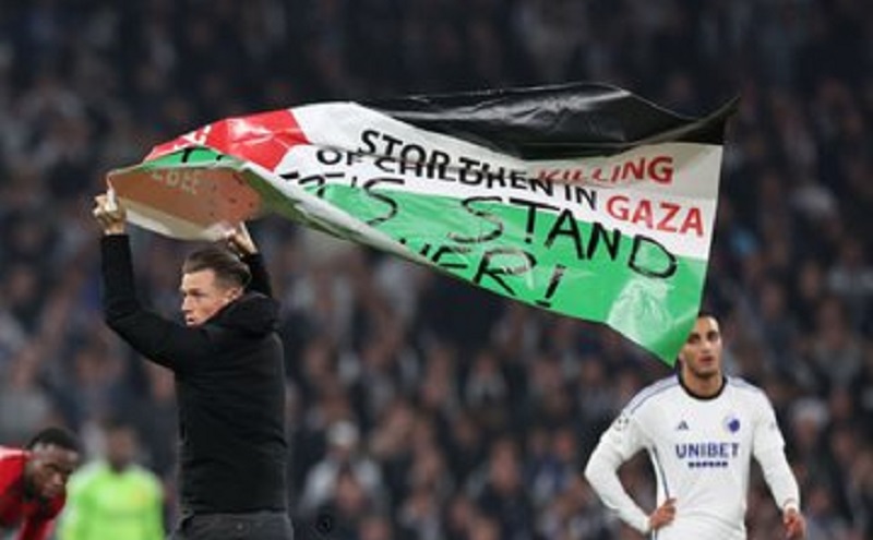 أقتحم أحد المشجعين، ملعب مواجهة مانشستر يونايتد الإنجليزي، مع مضيفه فريق كوبنهاجن الدنماركي، رافعا علم فلسطين، ضمن منافسات الجولة الرابعة، من مسابقة دوري أبطال أوروبا بالموسم الجاري 2023-2024.
