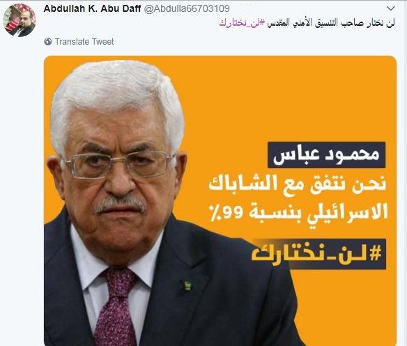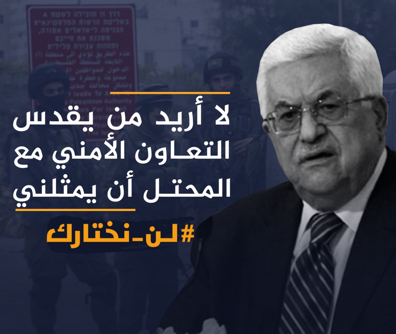 الناشط (ي.ق) تساءل في تغريدة له تحت وسم #لن_نختارك، لماذا لم يرحل الرئيس عباس بعد ما قبل على نفسه أن يعيش تحت بساطير الاحتلال!، وبعد أن قدس التنسيق الأمني ليحمى الشباب الإسرائيلي على حساب الشباب الفلسطيني.