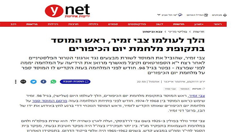 ترجمة للكوفية: توفي اليوم الثلاثاء، تسفي زامير ، رئيس جهاز الموساد خلال حرب أكتوبر 1973، عن عمر ناهز 98 عاما.