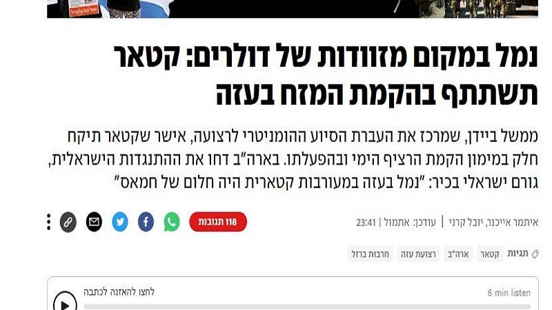 القدس المحتلة: ذكرت صحيفة "يديعوت أحرونوت" العبرية أن إسرائيل أبدت معارضتها لقرار الإدارة الأمريكية بإشراك قطر في تمويل بناء الرصيف البحري على شاطىء غزة وتشغيله من أجل تقديم المساعدات الإنسانية لسكان القطاع.