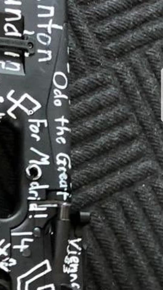 وكتب على سلاحه "Turkofagos" وهذة الجملة موجهة للأتراك تحديدًا "بعد البحث عن معناها تبين ان معناها قاتل الأتراك"، كما كتب على سلاحه عبارات، "فينا 1683" وهو تاريخ الحملة العثمانية الثانية على فيينا النمساوية والتي خسرها العثمانيين.