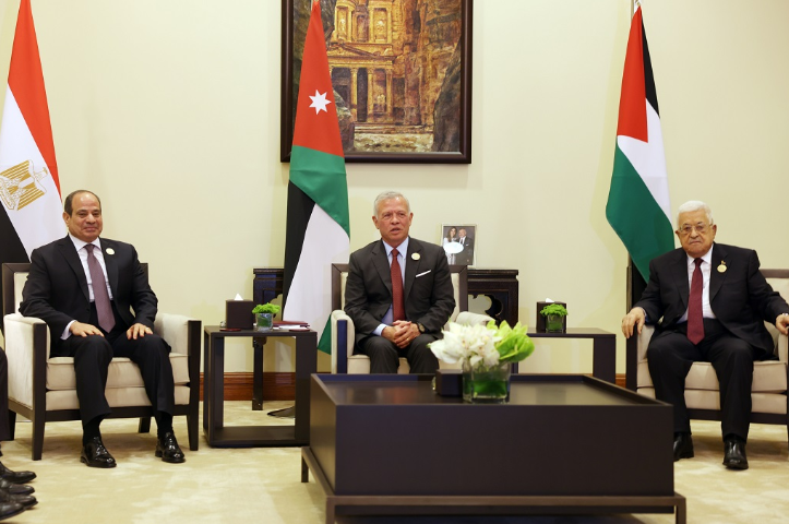 عمان: عقد العاهل الأردني الملك عبد الله الثاني، ورئيس جمهورية مصر العربية عبد الفتاح السيسي، والرئيس محمود عباس اليوم الثلاثاء، قمة ثلاثية في مركز الملك الحسين بن طلال للمؤتمرات بمنطقة البحر الميت، على هامش أعمال "مؤتمر الاستجابة الإنسانية الطارئة لغزة"، بحضور الوفود الفلسطينية والمصرية والأردنية المشاركة في المؤتمر.