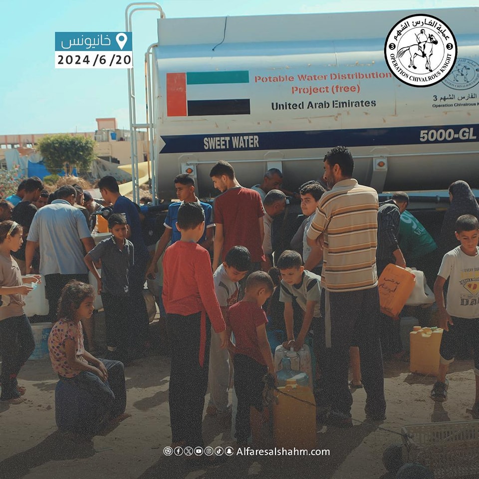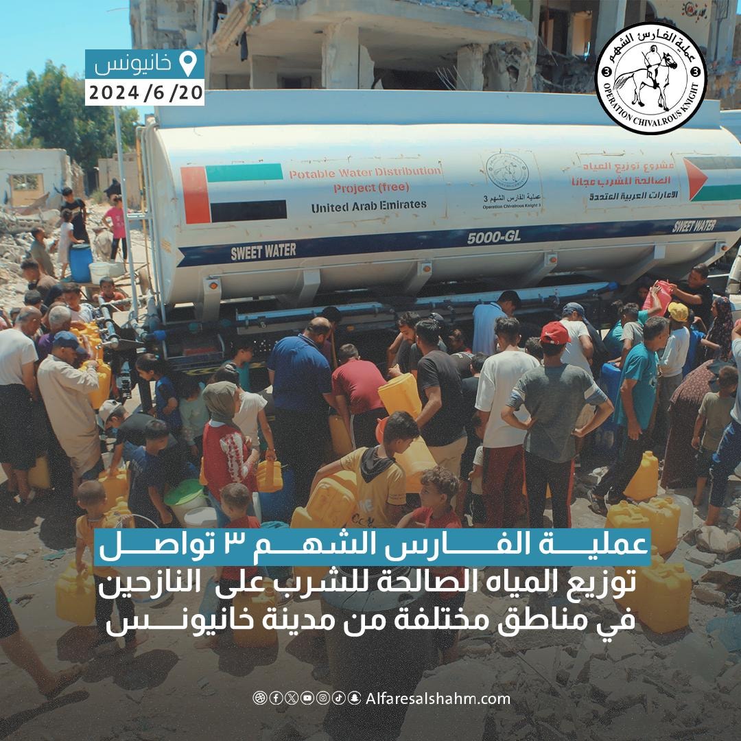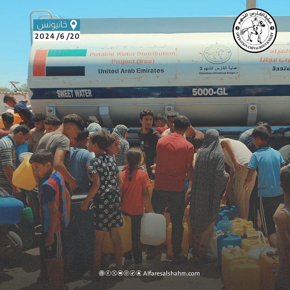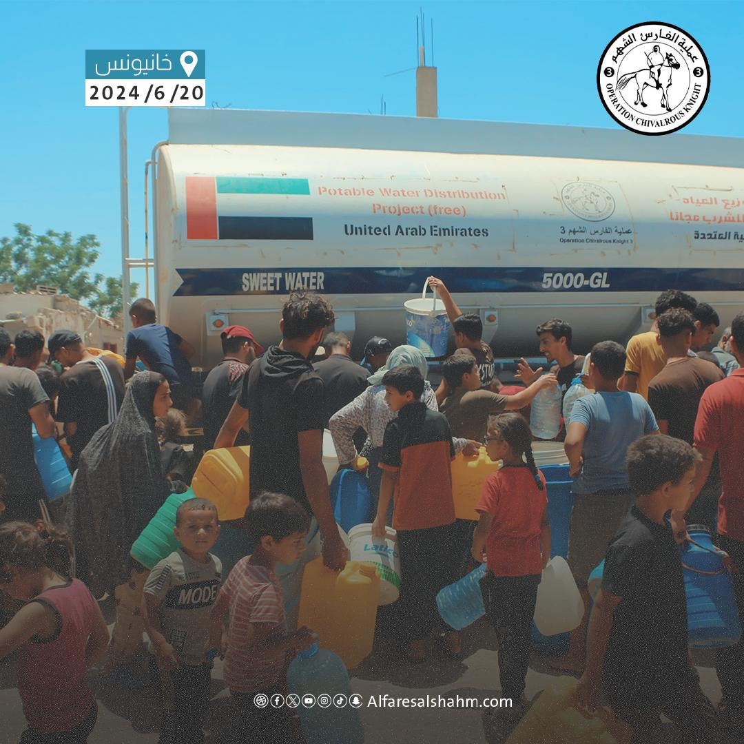 واصلت عملية "الفارس الشهم" عمليات توزيع المياه الصالحة للشرب على خيام النازحين في مدينة خان يونس جنوب قطاع غزة.