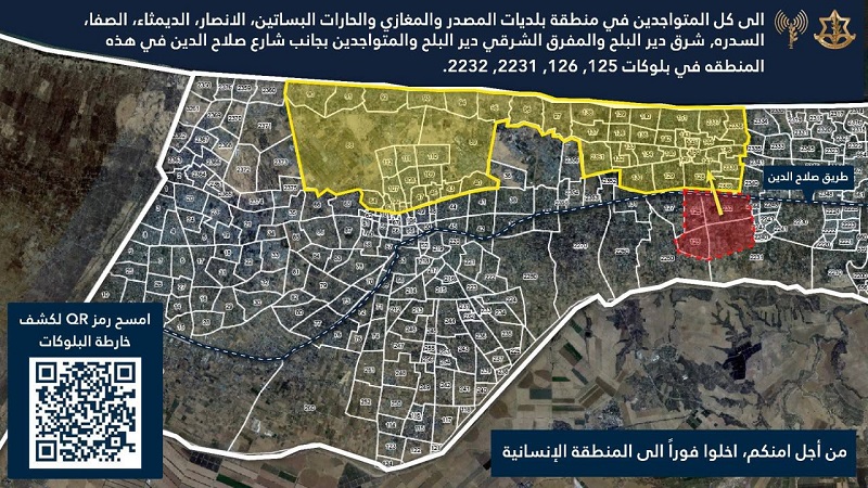 وأوضح أن الإخلاءات تشمل منطقة بلديات المصدر والمغازي والحارات البساتين، الانصار، الديمثاء، الصفا، السدرة، شرق دير البلح والمفرق الشرقي لدير البلح والمتواجدين بجانب شارع صلاح الدين في هذه المنطقة وتحديدًا في بلوكات 125، 126، 2231، 2232.
