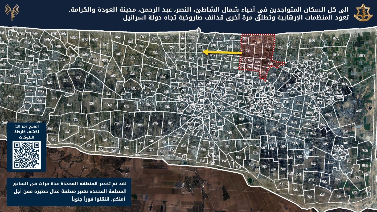 وقال متحدث الجيش الإسرائيلي أفيخاي أدرعي: "إلى كل سكان قطاع غزة المتواجدين في بلوكات 2270 و2260 و131 و2352 و2353 و2354 (في منطقتي القرارة ووادي السلقا) من أجل أمنكم، انتقلوا فورا غربا إلى المنطقة الإنسانية".