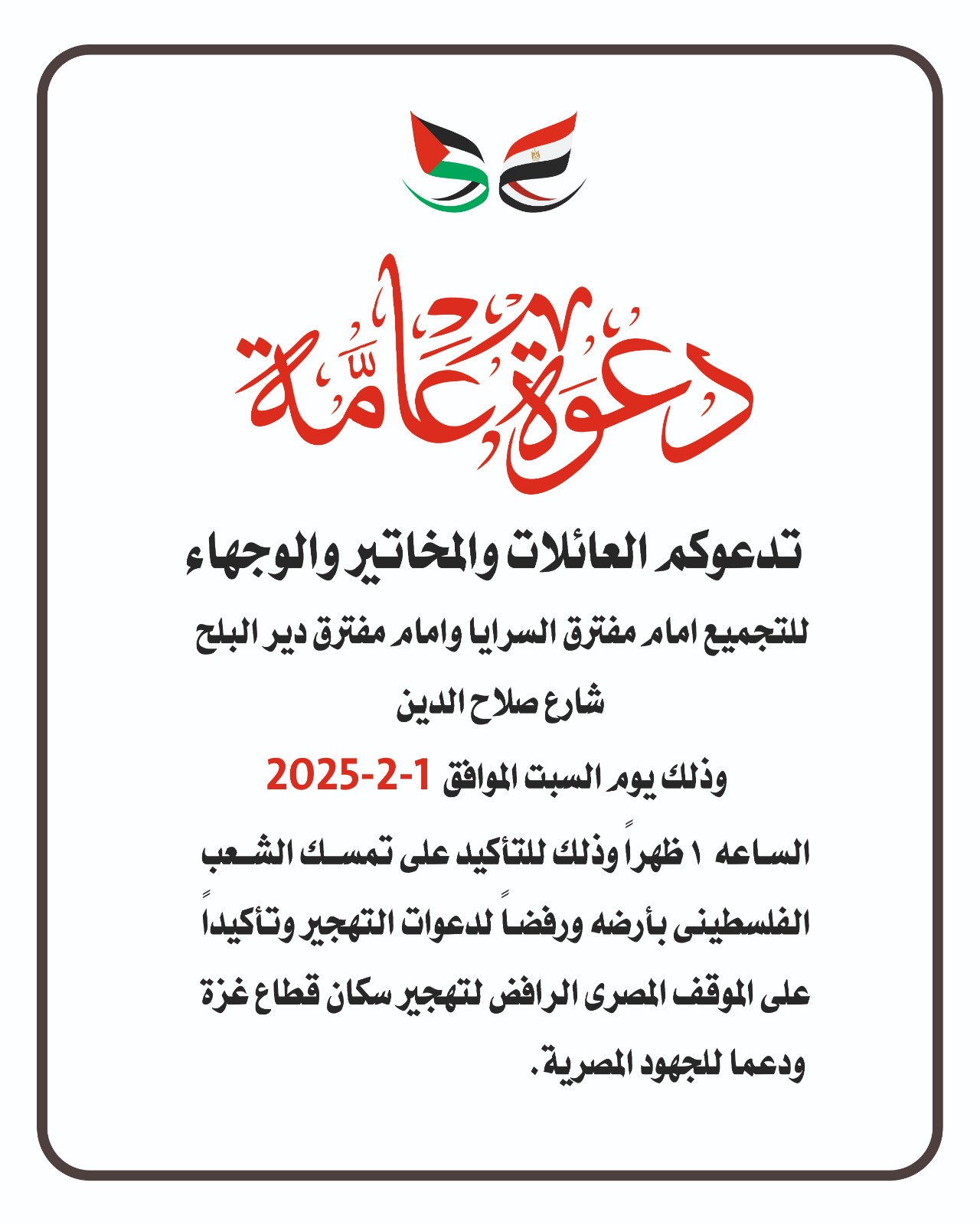 دعت العائلات والمخاتير والوجهاء بقطاع غزة، إلى تظاهرة يوم السبت المقبل، امام مفترق دير البلح بشارع صلاح الدين، تأكيدا على تمسك الشعب الفلسطيني بأرضه ودعما للموقف المصري الرافض لمخطط التهجير.