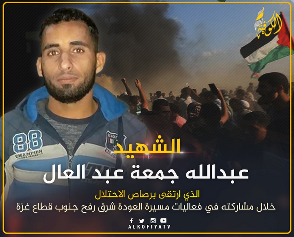 غزة: أعلنت وزارة الصحة الفلسطينية، الجمعة، استشهاد عبد الله جمعة عبد العال 24 عام متأثراً بجراح أصيب بها شرق رفح، جراء استهداف جيش الاحتلال للمتظاهرين السلميين.