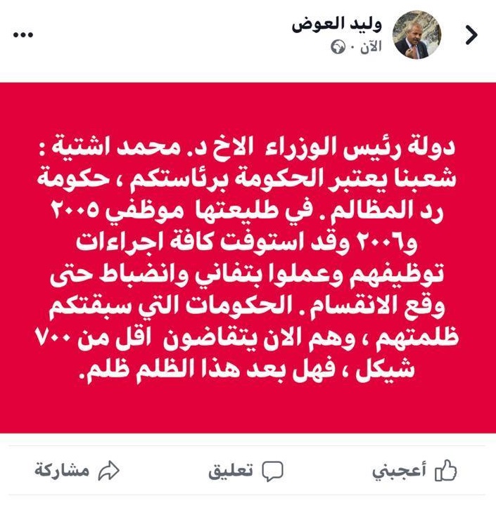 وأضاف في رسالته الموجهة لأشتية: "الحكومات التي سبقتكم ظلمتهم، وهم الآن يتقاضون أقل من ٧٠٠ شيكل، فهل بعد هذا الظلم ظلم".
