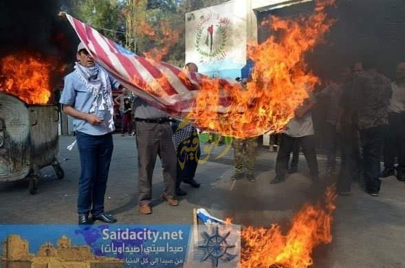 وندد المشاركون بالسياسة الأمريكية المنحازة لدولة الاحتلال الإسرائيلي، ورفعوا خلالها الأعلام اللبنانية والفلسطينية ولافتات "فلسطين ليست للبيع".