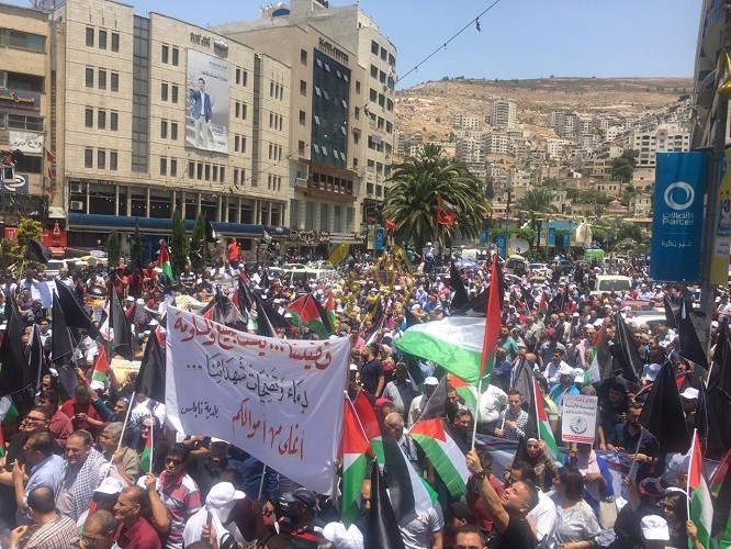 انطلقت مسيرة جماهيرية حاشدة في مدينة نابلس، رفع المشاركون خلالها الاعلام الفلسطينية والرايات السوداء، وأحرقوا العلم الإسرائيلي و"دمية للرئيس الأمريكي ترامب، تعبيرا عن غضبهم لعقد "الورشة الأمريكية بالبحرين" الهادفة لتصفية القضية الفلسطينية كمقدمة لتنفيذ "صفقة القرن".