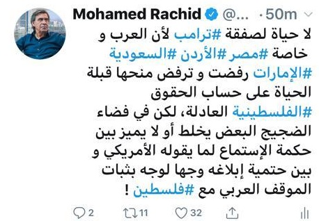 جاء ذلك في تغريدة لـ"رشيد" عبر حسابه الرسمي على موقع التواصل الاجتماعي، "تويتر"، اليوم الثلاثاء، قال خلالها :" لا حياة لصفقة ترامب لأن العرب وخاصة مصر والأردن والسعودية والإمارات رفضت وترفض منحها قبلة الحياة على حساب الحقوق الفلسطينية".