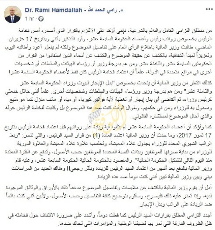 وقال الحمدالله، في منشور له اليوم الثلاثاء، على صفحته الشخصية عبر موقع التواصل الاجتماعي "فيسبوك"، "من منطلق التزامي الكامل والدائم بالشرعية، فإنني أؤكد على الالتزام بالقرار الذي أصدره أمس فخامة الرئيس بخصوص رواتب رئيس وأعضاء الحكومة السابعة عشر، وأود التذكير بأنني وبتاريخ 17 حزيران الماضي، طالبت وزير المالية باطلاع الرأي العام على تفاصيل الموضوع ولكنه لم يفعل. أعود وأطالبه اليوم، وتعزيزاً لمبدأ الشفافية، بالكشف عن حقيقة الموضوع والكشف عن أسماء الذين استفادوا من القرار من الحكومتين السابعة عشر والثامنة عشر ومن هم بدرجة وزير أو رؤساء الهيئات والسلطات أو شخصيات أخرى في مواقع متعددة في الدولة، علماً أن اعتماد فخامة الرئيس كان فقط لأعضاء الحكومة السابعة عشر".