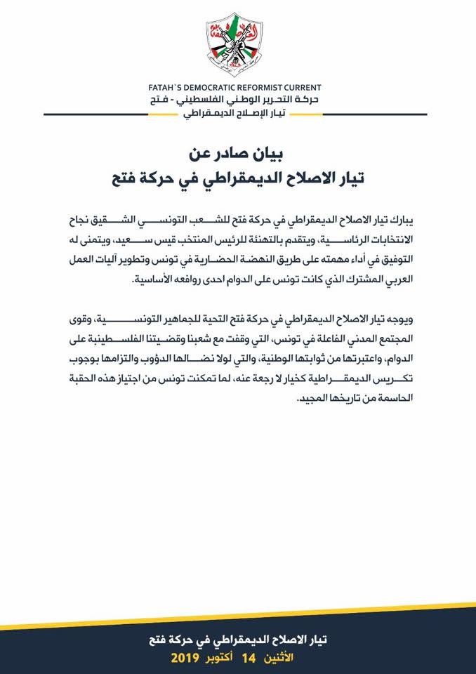 غزة : وجه تيار الإصلاح الديمقراطي في حركة فتح، التهنئة للشعب التونسي الشقيق على نجاح الانتخابات الرئاسية، والرئيس المنتخب قيس سعيد، وتمنى له التوفيق في أداء مهمته على طريق النهضة الحضارية في تونس وتطوير آليات العمل العربي المشترك الذي كانت تونس على الدوام احدى روافعه الأساسية.