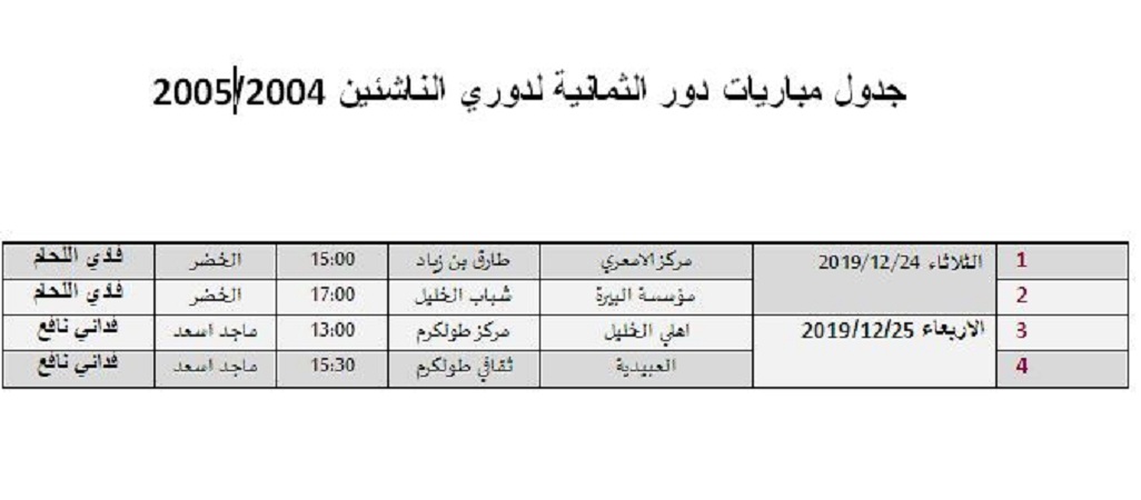 القدس المحتلة: أعلن الاتحاد الفلسطيني لكرة القدم، اليوم الأحد 22/12/2019 جدول مباريات دور الثمانية لدوري مواليد 2004/2005 كالتالي: