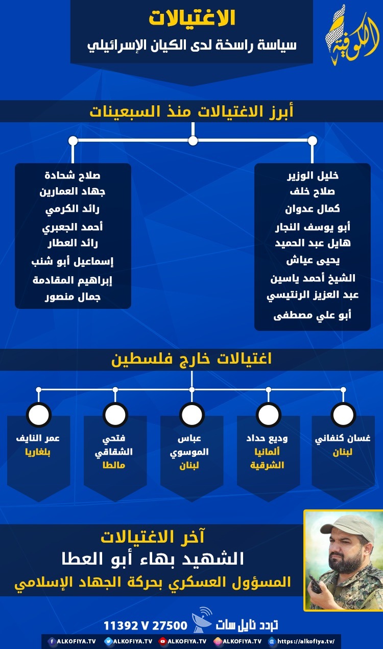 عهد أبو خوصة: في انتهاك صارخ لكل المواثيق الدولية والعالمية و الإنسانية يطل علينا وزير الخارجية الإسرائيلي يسرائيل كاتس بكل عنجهية، ليعلن عن عودة سياسة الإغتيالات بعد توقفها لسنوات، حيث يعتبر الكيان الإسرائيلي الاغتيالات أداة مفيدة له لتوسيع الفجوة الزمنية بين الحروب، وتشمل الاغتيالات قادة سياسيين وعسكريين ، وبدأ الاحتلال هذه السياسة  منذ فجر الصراع عام 1948 باغتيال وسيط الأمم المتحدة بين العرب واليهود والذي نادى مع بقاء القدس تحت السيادة العربية، وانتهاء في بهاء أبو العطا القائد في سرايا القدس.