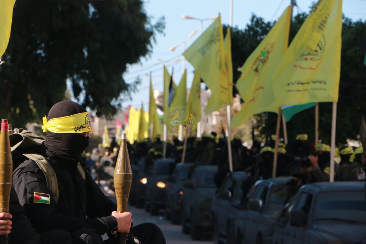 ونظمت كتائب شهداء الأقصى، مسيرا عسكريا مهيبا، انطلق من مفترق الأمن العام في حي النصر شمالي مدينة غزة، وصولاً إلى أرض كتيبة الشهيد ياسر عرفات، غربي المدينة.