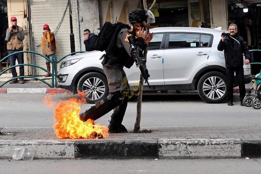 شاهد|| إصابة أحد جنود الاحتلال بزجاجة حارقة في الخليل