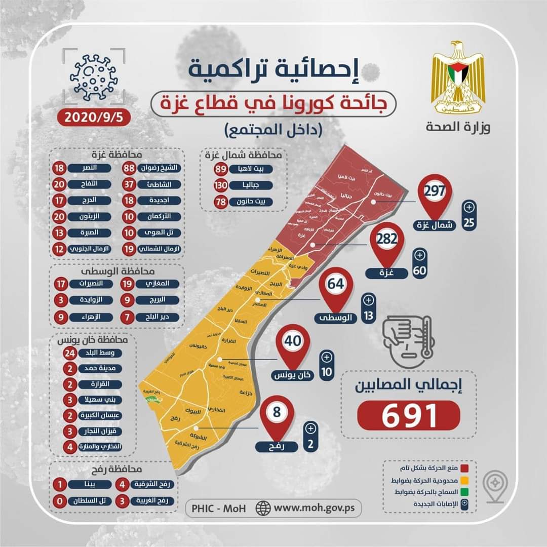 وقالت الصحة في الإحصائية التراكمية حول جائحة كورونا، إن إجمالي الإصابات 691، منها 297 شمال القطاع، 282 في غزة، 64 في الوسطى، 40 في خانيونس، 8 في رفح.