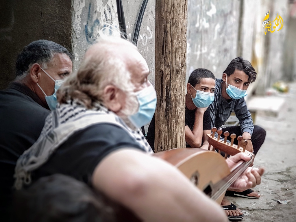 غزة- عمرو طبش|| داخل زقاق في حي الشابورة بمخيم رفح، جنوب قطاع غزة، يلتقط المواطن توفيق شناعة، آلة العود الموسيقية بكلتا يديه، يضع أصابعه عليها ليبدأ في عزف أجمل الألحان لأطفال الحي، الذين راحوا يستمعون لألحانة التي باتت المصدر الوحيد للتسلية في ظل منع التجول في المخيم بسبب تفشي فيروس كورونا.