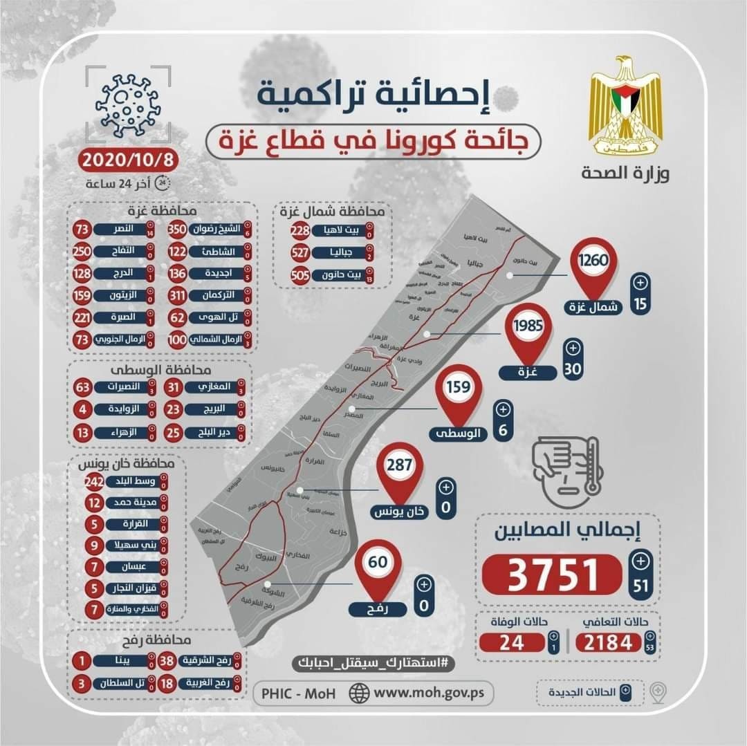 صحة غزة تنشر الخارطة الوبائية لمصابي "كورونا" الخميس 8 أكتوبر 2020