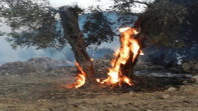 رام الله: أضرم مستوطن، اليوم الجمعة، النار بمئات أشجار الزيتون المعمرة في قرية صفا غرب رام الله.