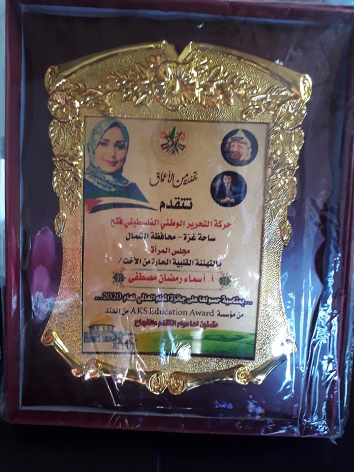 غزة: زار وفد من محافظة الشمال بتيار الإصلاح الديمقراطي في حركة فتح، أفضل معلم عالمي لعام"2020" معلمة اللغة الانجليزية أسماء رمضان حسن مصطفى والتي نالت جائزتها  من مؤسسة "AKS Education Award" في الهند، وذلك ضمن 100 معلم في العالم، بينهم 4 معلمين من فلسطين.