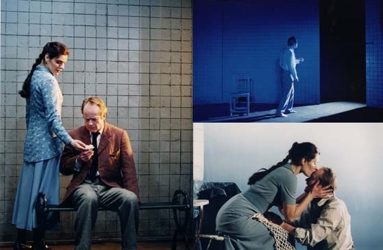 ينصب التركيز هنا على وصف الشرط وليس على العملية تجري في ظل منزل مجنون. يشكل جدار البلاط الأبيض المتسخ الذي صممه المصمم بيتر هولم الخلفية ويسمح في النهاية بالتعايش مع السماء الزرقاء لراحة البال، شخصية اندرس اهلبوم في حركة مستمرة بجنون العظمة بعيون واسعة وخط ثابت. ومع ذلك فقد تمكن من إضافة رجولية إلى الدور، في حين أن السيدة لديها بناتية غير واضحة تجعل اللقاء بينهما مستحيلًا, تتوقف مهمتها عند المهمة المشهورة: المرأة المتسامحة التي ستقود العبقرية إلى الطريق الضيق مسرحية الطريق الى دمشق صدر الجزء الأول والثاني سنة ١٨٩٨ م وهي مستمدة من حياته الشخصية، فالبطل يتخلى شيئاً فشيئاً عن ممتلكاته الدنيوية من ضمنها الشهرة والنساء، وعندما لم يبق هناك شيء يتجه إلى دير غير طائفي ولا متعصب للعقيدة المسيحية فيكرس حياته لخدمة الإنسانية جمعاء تقول له إحدى الشخصيات من المسرحية: "لقد بدأت حياتك بقبول كل شيء, ثم مضيت فأنكرت كل شئ والآن تنتهي حياتك بمحاولة استيعاب كل شيء"، ولا شك أن هذه المسرحية تصور أحلام وطموحات سترندبرج من معانقة الإنسانية ومحاولته الخروج من الموضوعات المحدودة كموضوع الصراع بين الجنسين.