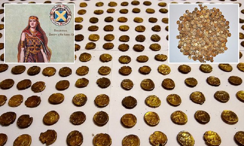 واكتشف مراقب الطيور البريطاني، والذي لم يكشف عن اسمه، على مخبأ للعملات السلتية الذهبية أثناء مراقبته صقرا في حقل محروث حديثا في شرق إنجلترا.