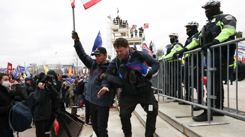وقد تمكنوا من اختراق الحواجز الأمنية المحيطة بمبنى الكابيتول واعتلاء منصة وضعت من أجل تنصيب بايدن.