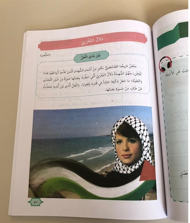وعرض "بركات" كتبا دراسية من مؤسسات تعليمية تابعة لوكالة الغوث، تمجد الشهيدة دلال مغربي التي وصفها بالإرهابية.